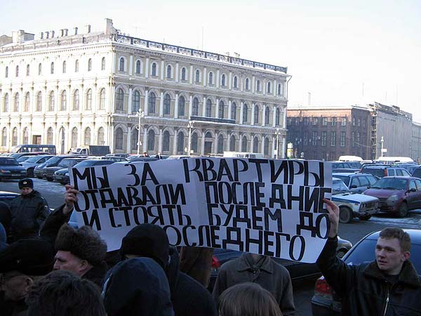 Около двухсот человек протестовали среду против Жилищного кодекса РФ у стен Законодательного собрания Санкт-Петербурга. В акции приняли участие представители Объединенного гражданского фронта, НБП, движения "Наш выбор", партии "Яблока", коммунистов, а также обманутые дольщики города.