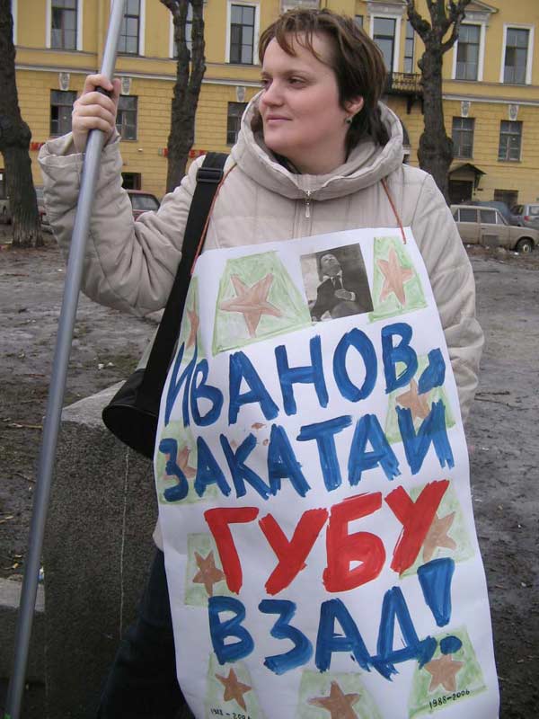 После этого на тротуаре Дворцовой площади собравшиеся сожгли чучело министра Иванова. Такого "демарша" милиционеры явно не ожидали, и, будучи бессильными остановить это действо, тут же арестовали "поджигателя" Виктора Перова, активиста движения "Коммунисты Петербурга". Затем была доставлена в отделение Ольга Курносова, организатор акции, председатель регионального отделения ОГФ. В настоящее время ее освободили, однако 11 апреля ей предстоит суд за организацию и проведение несанкционированного митинга.