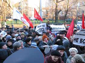 Участники пикета держали плакаты с надписями: "Сегодня - пикет, завтра - Марш несогласных", "Новый год без Бооса", "Депутаты, служите нам, а не Боосу", "Бакалина в отставку" (Владимир Бакалин - председатель комитета по социальной политике при областной Думе, который на минувшей неделе делал позитивный доклад по итогам монетизации в регионе).