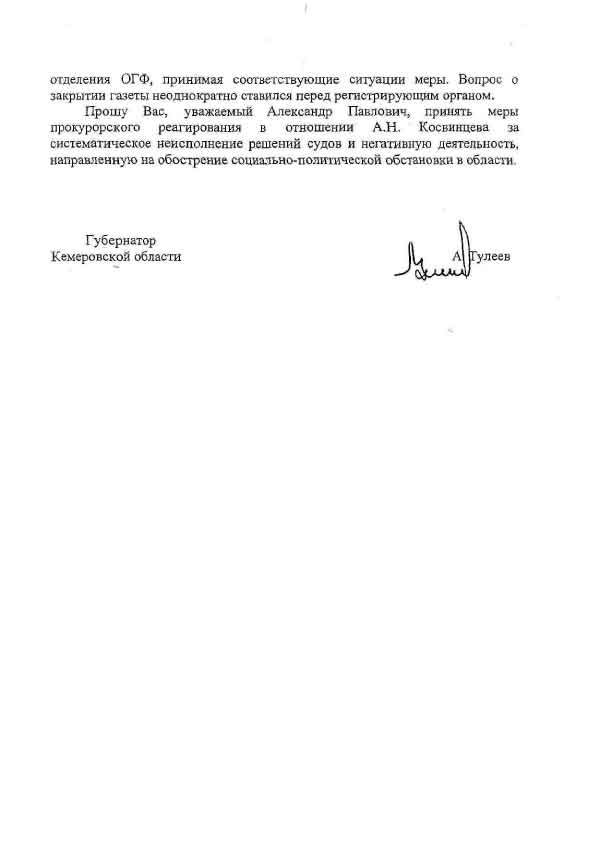Ранее сообщалось, что в апреле 2006 года Косвинцев получил письмо из прокуратуры Центрального района областного центра с требованием явиться для дачи объяснений "о причинах неисполнения решений суда об обязании опубликовать опровержение не соответствующих действительности и порочащих честь и достоинство органов государственной власти Кемеровской области сведений".