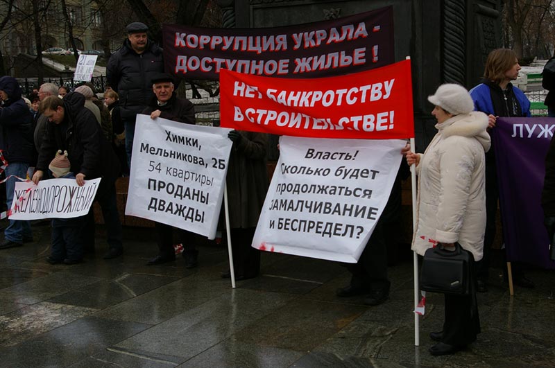 На митинге дольщики распространяли свое обращение, в котором призвали недовольных действующей властью граждан на выборах 11 марта портить избирательные бюллетени. Они заявили о начале новой акции, участники которой будут перечеркивать красной ручкой в своих бюллетенях список всех партий и писать "Нет коррупции власти". "Чем больше "красных бюллетеней" окажется в урнах, тем весомее будет наш сигнал о недоверии к власти", - говорится в обращении дольщиков.