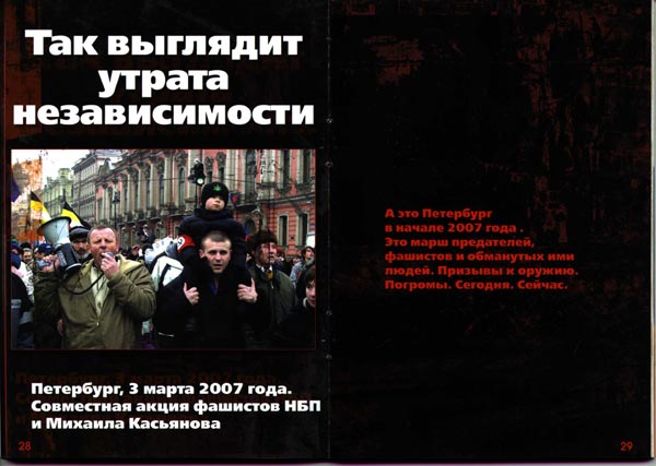 "Вот и у нас сейчас праздники, заботы, жизнь идет. А ведь в Москве недавно прошел настоящий фашистский марш" - сокрушается компактная книжица. На фотографии лидер Славянского Союза Дмитрий Демушкин вскидывает руку в нацистском приветствии. Снизу три аккуратные буквы – НБП. На следующей страницы – фотографии с "Марша несогласных" в Санкт-Петербурге. Бумага, кажется, от возмущения сейчас задымится – "фашисты, предатели обманщики". Еще бы, посмели против "Газпром-Сити" протестовать. Ветераны – блокадники, вышедшие на Марш, не в силах более терпеть издевательства над родным городом, теперь обязаны надеть свастики – Миллер приказал и Якеменко подтвердил. Разумеется, если всякий порядочный человек немедленно не заявит о своей поддержке Владимира Путина, завтра к нам прилетит НАТО, а Тверскую улицу переименуют в честь Джорджа Буша. Пока, правда, "фашисты" переименовывают улицу имени Кадырова, но эта акция освещения в агитматериале не получила.