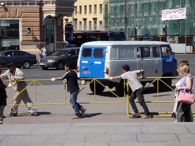 На углу этой же улицы – два микроавтобуса, в которых сотрудники милиции в штатском переодеваются в форму. Вдоль всего маршрута в переулках и во дворах стоят милицейские автобусы. Попадаются и легковые машины, явно принадлежащие все тем же правоохранительным органам, но без опознавательных знаков.