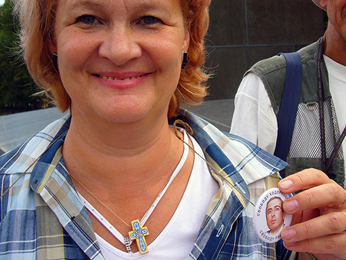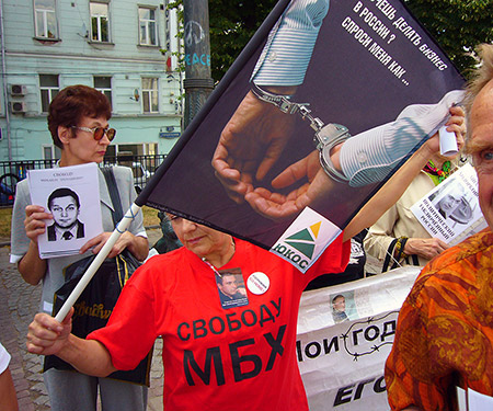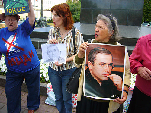 Около 80 человек собралось возле памятника Гоголю: правозащитники, простые граждане и пресса. Участники мероприятия держат в руках фотографии Ходорковского и плакаты: "Свободу МБХ", "Бесчестным все кажется бесчестным", "Узники Кремля – узники совести", "Свободу Ходорковскому, Путина в Читу" и другие. Очень много плакатов в поддержку Светланы Бахминой.