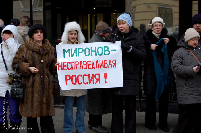 В мероприятии приняло участие около 20 человек. Участники пришли с плакатами: "Миронов, оттолкни несправедливый закон", "Олимпиада не повод для беспредела", "Миронов — несправедливая Россия", "Нет рейдерскому закону". Акция была не согласована с властями. Сразу после ее начала появился человек в штатском, запретивший журналистам снимать мероприятие. У главы московского отделения партии "Яблоко" Сергея Митрохина проверили документы. Задержана одна из участниц пикета Мария Штынько. Сейчас девушка находится в ОВД "Тверское", где стражи правопорядка составляют протокол об административном правонарушении.