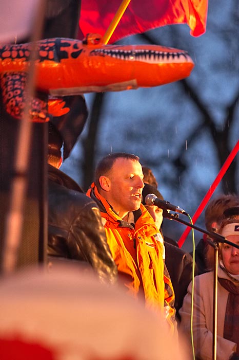 Выступили лидеры коалиции "Другая Россия" Гарри Каспаров и Эдуард Лимонов. Руководитель ОГФ Гарри Каспаров заявил, что 3 марта войдет в историю России. Он напомнил манифестантам, что "после позорного фарса "выборов" Медведев, Путин и Зубков пошли праздновать победу над Россией. "От нас зависит, - сказал он, - когда прекратится этот шабаш, который угрожает России. Свободные люди еще дойдут до Смольного и Кремля и именно их боятся путины, медведевы и матвиенки! Их страх выражается в толпах ОМОНа и десятках задержанных в Москве".