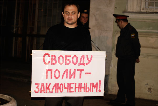 По его словам, из 15 человек, которые провели ночь в ОВД, внутри остались пятеро. Они ожидают предоставления им копий протоколов задержания. Всех задержанных обязали 15 апреля явиться в 370 участок Тверского суда Москвы. Их обвиняют в нарушении правил пикетирования (20.2 КоАП) и неповиновении милиции (19.3 КоАП), по последней статье им может грозить до 15 суток ареста.