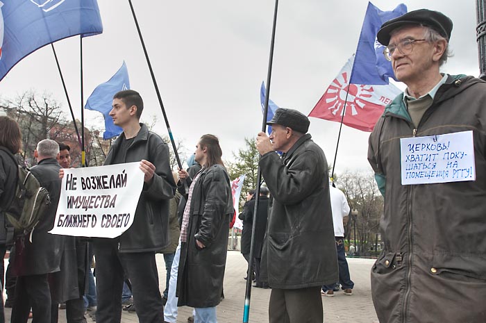 Участники пикета держали растяжку: "Руки прочь от РГГУ!", а также плакаты: "Не возжелай имущества ближнего своего!" и "Нет церковному рейдерству!".