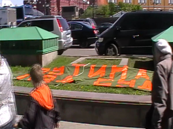 Растяжка была прибита к земле на газоне на Моховой улице, она провисела 20 минут. Сотрудники ОМОНа и милиции, оцепившие Манежную площадь, ее так и не заметили. Сняли ее дворники.