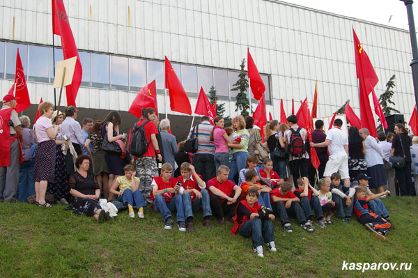 Место сбора участников — центральный вход Всероссийского выставочного центра — пестрел от красных знамен. Здесь собрались активисты различных ячеек КПРФ, СКМ, РКСМ(б) и АКМ. В руках у них были плакаты, требующие объективного освещения деятельности КПРФ, против клеветы на лидера компартии Геннадия Зюганова, а также за соблюдение морали и нравственности и против "очернения" истории Советского Союза. Многие участники восхваляли Иосифа Сталина как на плакатах, так и лозунгами. Молодежь школьного возраста держала в руках атрибутику КПРФ, многие были в масках телеведущих. В 17:30 по команде милиции колонна двинулась к телецентру.