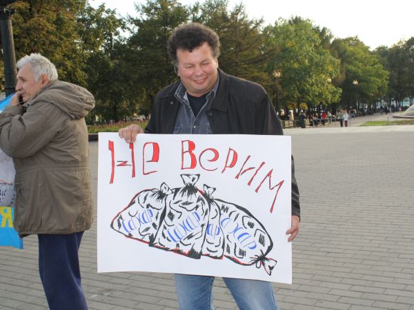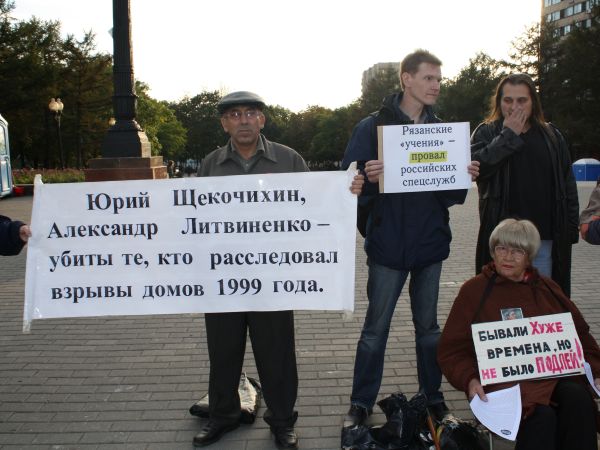 Участники держали транспаранты следующего содержания: "22 сентября 1999 — "рязанские учения" ФСБ и день недоверия", "Юрий Щекочихин, Александр Литвиненко — убиты тем, кто расследовал взрывы домов 1999 года". Также у пикетчиков были плакаты "Рязанские "учения" — провал российских спецслужб", "Учения в Рязани — что это было?", "Разжигатели национальной вражды — враги России".