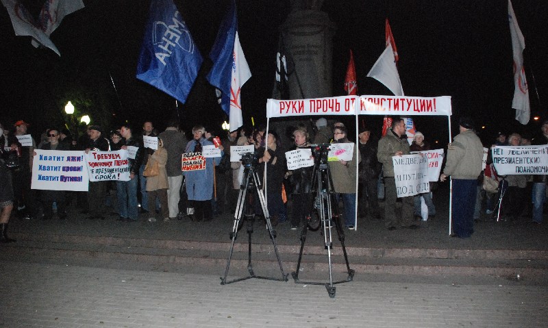 По словам организаторов пикета, в условиях тотальных фальсификаций на выборах, цензуры в федеральных СМИ и преследований оппозиции увеличение президентского срока открывает дорогу к установлению в России диктаторского режима. Продление полномочий правящей группировки является попыткой президента, правительства и партии "Единая Россия" уйти от ответственности за последствия финансово-экономического кризиса, который набирает обороты в стране, уверены участники акции.