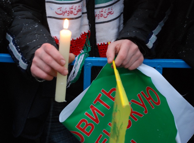 Корреспондент отмечает, что все участники акции — палестинцы, коммунисты и простые граждане — были в платках-"арафатках". Также корреспонденту стало известно, что перед зданием израильского посольства был разрешен только пикет на десять человек, однако милиция не стала препятствовать сбору людей. Даже когда один из участников кинул в сторону израильского посольства некий предмет, милиция не стала предпринимать никаких действий.
