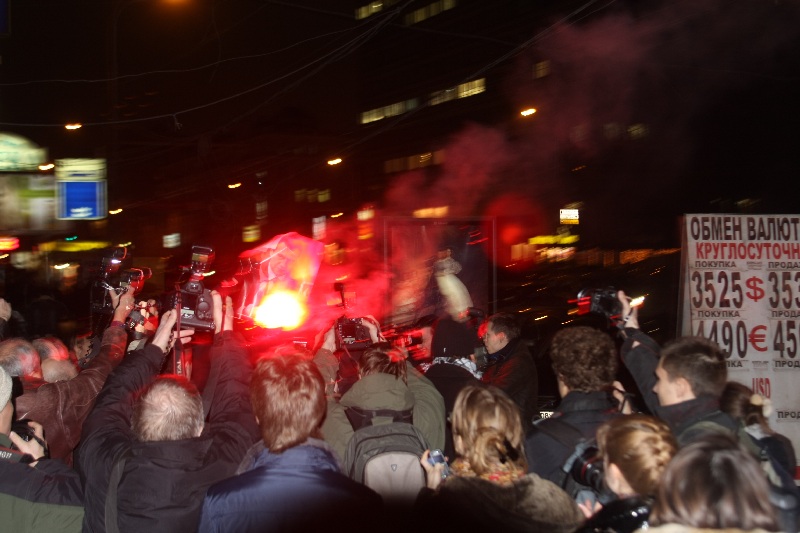 Около двухсот участников шествия скандировали: "Свободу политзаключенным!", "Нам нужна другая Россия!", "Россия без Путина!". Они несли флаги ОГФ, "Обороны", "Смены" и других оппозиционных движений, а также растяжку "Путина в отставку". По дороге они зажгли файеры и сожгли портрет президента России Дмитрия Медведева.