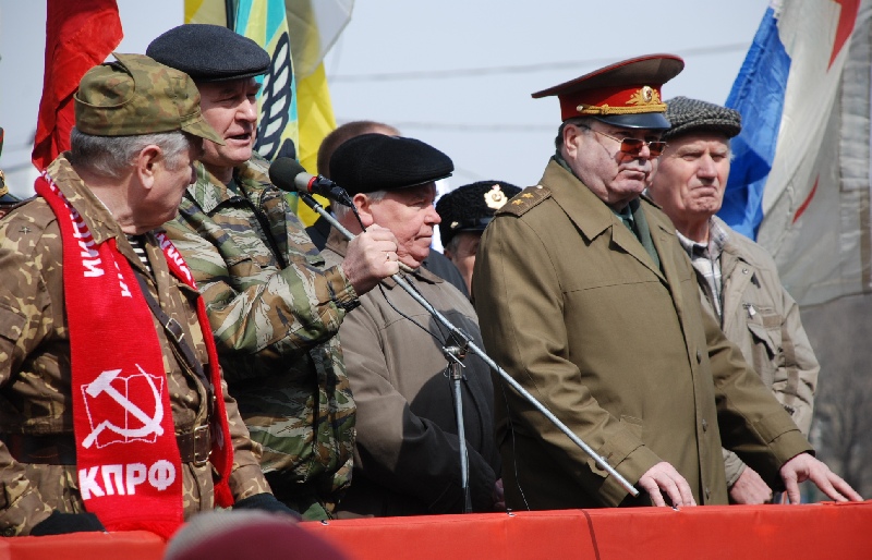 Генерал-майор авиации Евгений Копышев, представлявший Союз советских офицеров, рассказал собравшимся о "провокации, которую готовят власти на 9 Мая". По его словам, из парадного расчета исключена колонна участников и ветеранов войны. Он назвал это оскорблением всех, кто участвовал в Великой Отечественной войне. Он считает, что такими темпами через два года на празднование 9 Мая парад возглавит колонна американской техники.