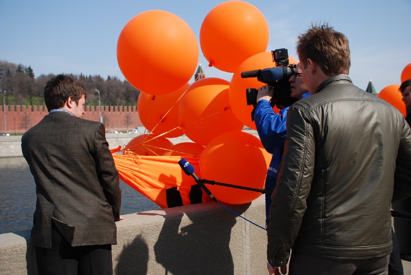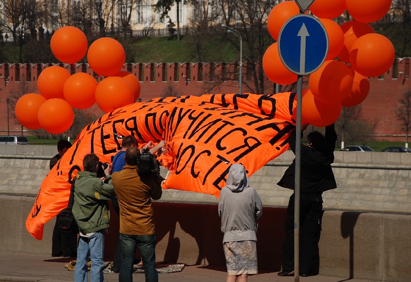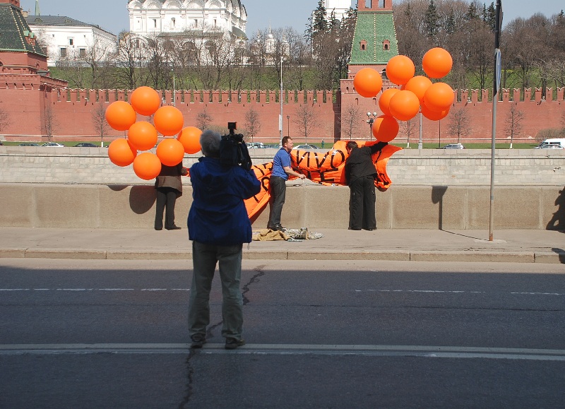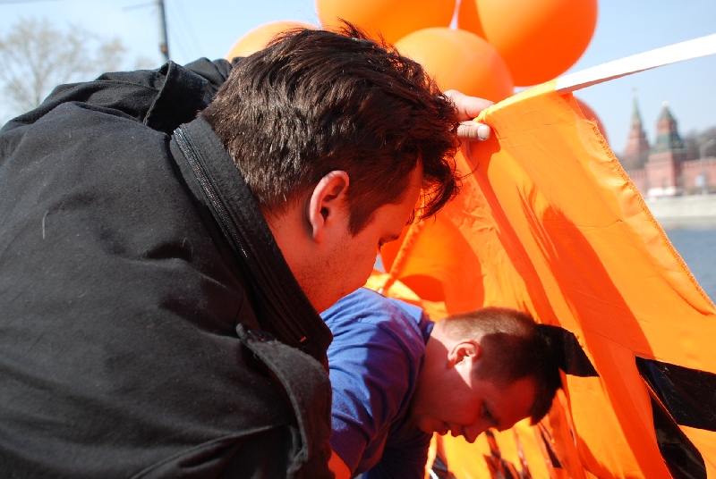 Как сообщил корреспондент, трое активистов "Солидарности" на Софийской набережной напротив Кремля спустили на воду большой оранжевый баннер "Медведев! Уволь Путина! Может быть получится!".