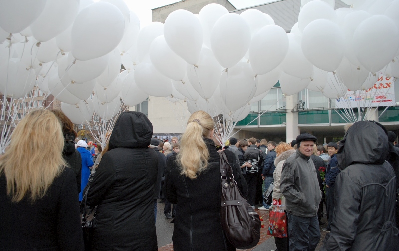 Как всегда у портретов погибших зажгли свечи, возложили цветы. После минуты молчания были зачитаны имена 130 погибших, затем в небо выпустили 130 белых воздушных шаров.