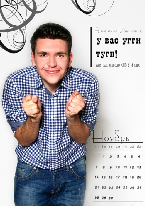 "У Газпрома мечты сбываются, а как же я?", "Я студент-бомж готов убирать снег", "А можно мне тоже повеселиться на Авроре", — обращаются студенты со страниц календаря к Матвиенко.