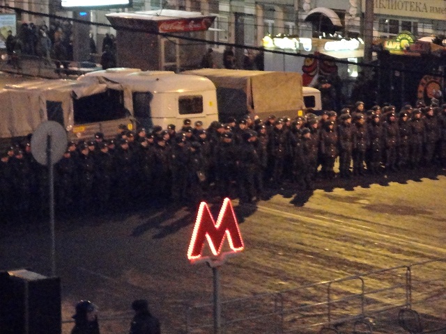 22:11 ОМОН зачищает площадь и предлагает всем прекратить противоправные действия и пройти в метро. В ответ им скандируют лозунги.