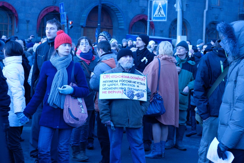 Затем полиция оттеснила митингующих от Законодательного собрания, толпа продолжала сканадировать "Россия без Путина", "Нам нужна другая Россия", "Даешь честные выборы" и другие.