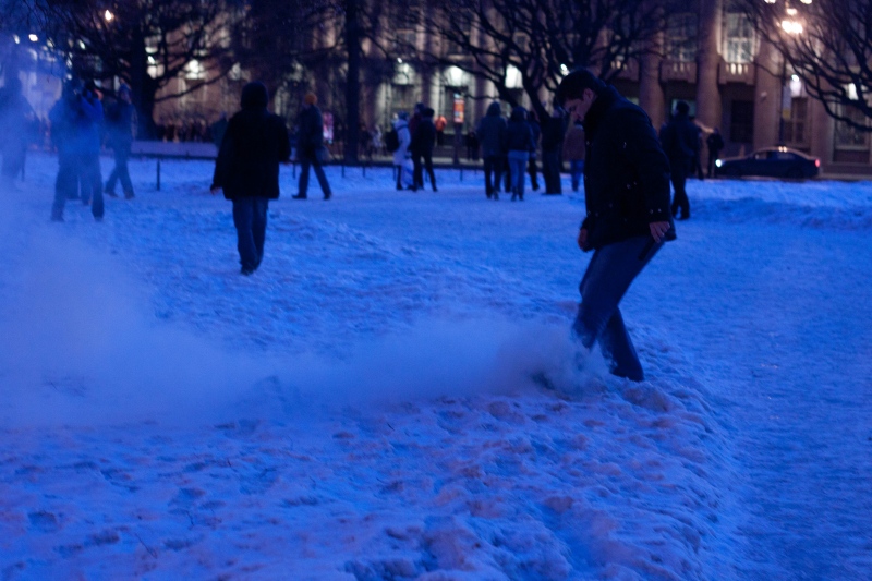 В сотрудников полиции кидали снег, лед и бутылки. Несколько раз из толпы вылетали дымовые шашки и небольшие фейерверки.