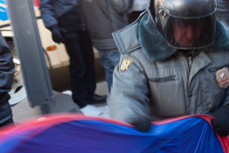 Акция началась с задержания оппозиционерки Ольги Курносовой и националиста Николая Бондарика, которые разбросали возле метро листовки "Русская весна" с планом действий оппозиции на ближайший год.