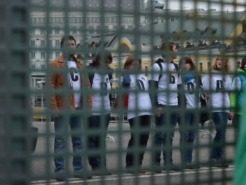 Но эту просьбу проигнорировали националисты, их трехцветные флаги продолжали развиваться в небе. Позже свою атрибутику подняли "яблочники", активисты из ЛГБТ-движения, РСД и анархисты. Активисты из движения "Партизанинг" вдали над толпой подняли собственный политический "атрибут" — надувную блестящую конструкцию, похожую на фаллос.