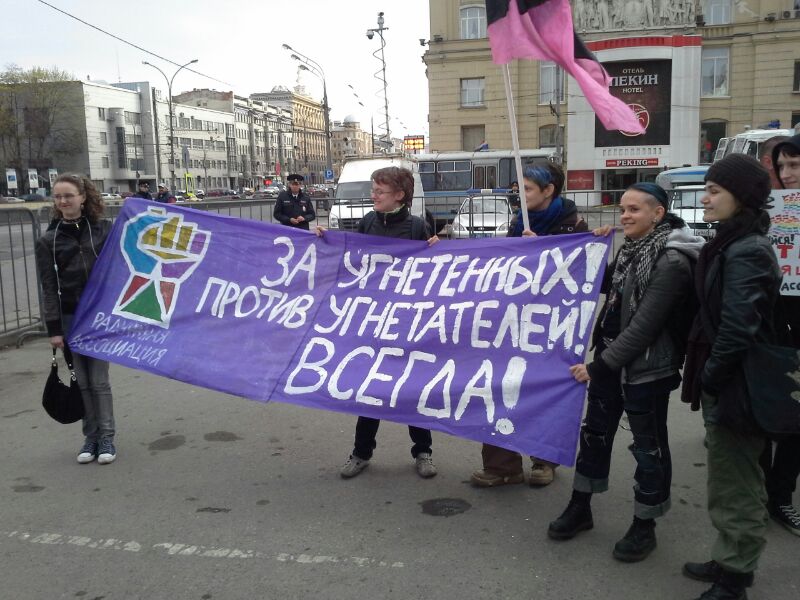 На Триумфальную площадь вышли анархисты, феминистки и представители таких левых движений, как "Автономное действие", Союз левых демократов, Российское социалистическое движение, социалистическая группа "Манифест", Femband и других.