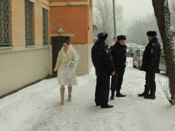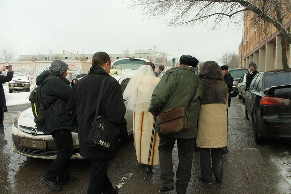 Я прошла в другую комнату, Ильдар меня увидел, дальше все проходило, как бывает обычно — нас спросили, согласны ли мы, есть ли какие-то препятствия к вступлению в брак, потом сказали, что можно расписаться и поцеловаться. Мы поцеловались. Потом нам сказали, что можно постоять вместе несколько минут. Мы обнялись, а потом его увели",