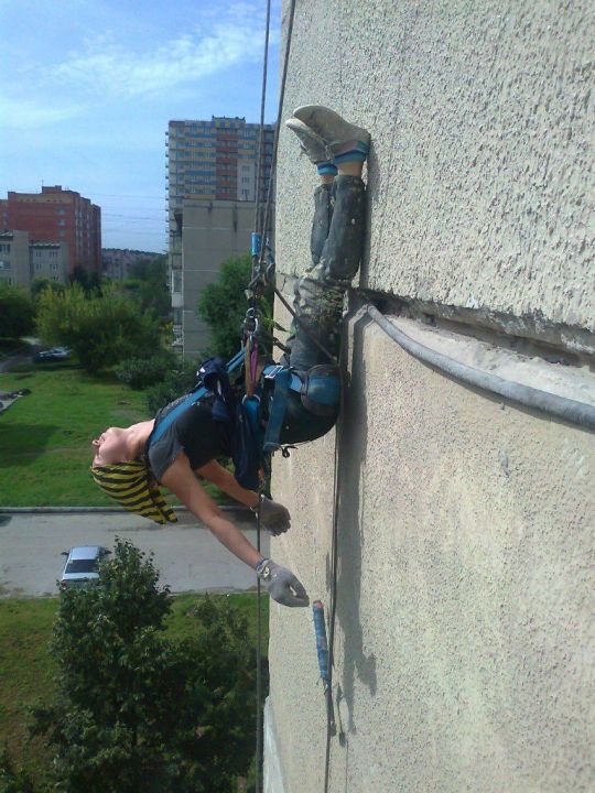 Мой первый опыт — на строительных лесах. Теперь окна мою, швы на стенах заделываю, выдираю старую теплоизоляцию, крашу. Тяжко — я все-таки небольшая женщина. Летом рамы окон раскаляются так, что можно ожог получить, зимой замерзаешь на стене. Особенно когда в Новосибирске работаешь: зимы у нас суровые. В центре Новокузнецка работать помягче было — ветра меньше, но там от заводов стоит адский смрад. Погода создает много проблем. То дождь зимой, то град и шквальный ветер летом.