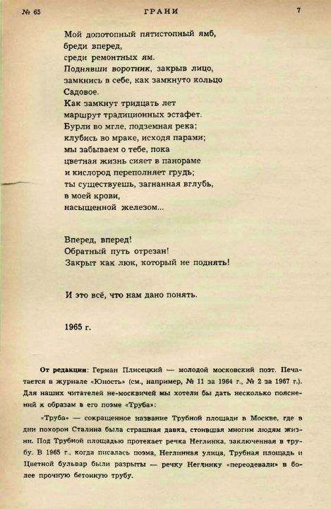 [11] В редакционном послесловии было указано, что поэма "Труба" публикуется без ведома автора (Грани. 1967. № 65. С. 8). Такова была стандартная практика в русскоязычных эмигрантских изданиях при публикации материалов, подписанных подлинными именами авторов, которые находились в СССР и могли подвергнуться за это каким-либо репрессиям со стороны властей.
