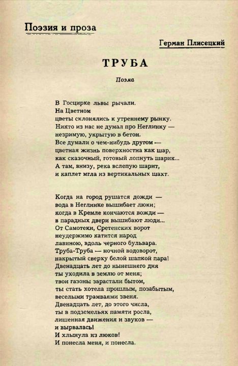 Первая публикация поэмы Германа Плисецкого "Труба" случилась в таком издании, на предложение печататься в котором любой советский поэт согласился бы едва ли – принимая во внимание неизбежные для себя последствия.