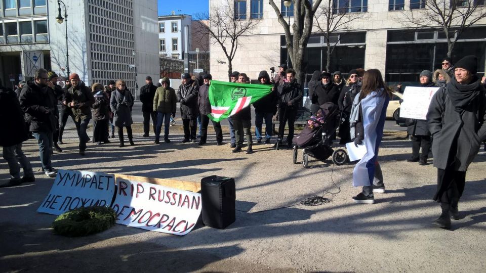 В 14 часов протестующие переместились на Александерплатц и стартовали оттуда похоронную процессию с гробом и траурным маршем. Дойдя до посольства процессия остановилась и устроила "похороны русской демократии после продолжительной болезни с надеждой на скорейшее воскресение". Панихида завершилась митингом. Примерно в это время очередь у посольства впервые за день оказалась малочисленнее митинга протестующих.