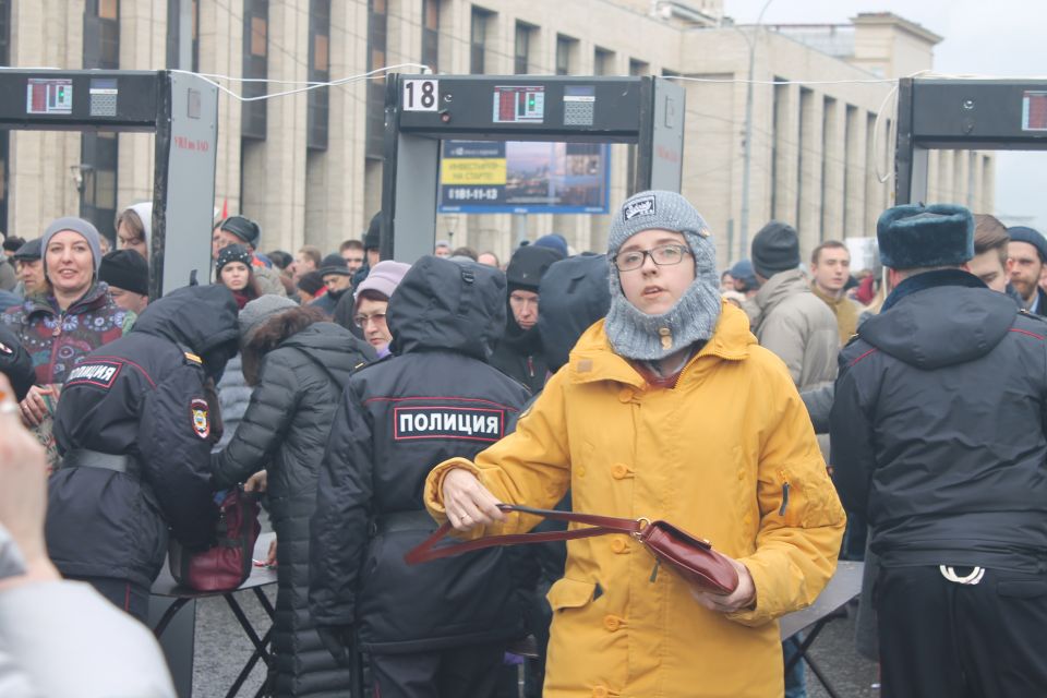 За час до начала на проспекте было уже пару тысяч человек. Полицейские "тщательно" обыскивали всех входящих, поэтому на входе у рамок скопилась очередь.