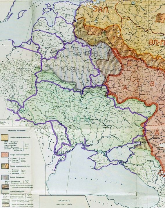 На карте 1914 года ареал расселения украинского народа (ядро малорусских говоров) закрашен бледно-зеленым цветом, белые вкрапления на этом фоне — совместное расселение украинцев и инородцев с преобладанием украинцев, а бледно-зеленые вкрапления на белом фоне — напротив, совместное расселение украинцев и инородцев с преобладанием последних (инородцы — это народы, отличные от русских, украинцев и белорусов). Ареал расселения белорусского народ закрашен серым. Ареал расселения нынешнего русского народа (тогда — великорусов) закрашен желтым и оранжевым цветами. Области, где жили совместно три части тогдашнего общерусского народа, показаны штриховкой, причем карта не дает понятия о преобладании той или иной его части.