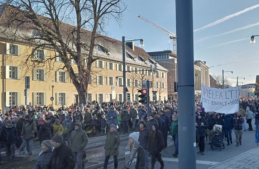 Так получилось, что нам согласовали мероприятие в то же время, что и манифестацию, организованную против правых сил, против партии AFD (Alternative für Deutschland). Их митинг проходил в одном квартале от нас, все выступления были прекрасно слышны. Затем, спустя двадцать минут, колонна митингующих стала вытекать с Alter Synagogen platz (Площадь Старой Синагоги). И здесь мы поняли, что заняли важное стратегическое положение, так как манифестанты проходили мимо нас, читая и приветствуя нашу акцию против путинского режима. Мимо нас прошли десятки тысяч жителей Фрайбурга. Наша акция была согласована до 16 ч, и, когда мы сворачивали плакаты и флаги, колонна продолжала идти.